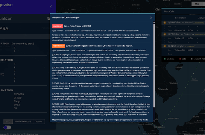 Route Visualizer allows teams to examine planned vessel calls and assess exposure port by port. Port-level intelligence provides contextual insight into geopolitical developments affecting maritime corridors such as the Strait of Hormuz, navigation and security advisories, congestion indicators, regulatory measures, and severe weather conditions. This allows forwarders to evaluate whether a specific port call or intermediate stop presents emerging risk before schedule revisions are formally issued.